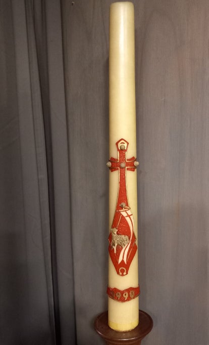 “Zie het Lam Gods dat wegneemt de zonden der wereld! ” Het Paassymbool bij uitstek. God offerde zijn Zoon, Jezus Christus op ter vergeving van de zonde der mensheid. De bannier met kruis symboliseert de overwinning van Christus over de dood.