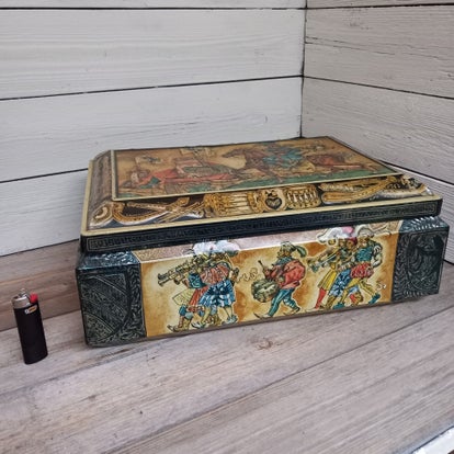 Dit is een blik van de Firma Schmidt uit het Duitse Nurnberg. Hij was voor lebkuchen, een soort speculaas koeken. Rijk gedecoreerd met muzikalische afbeeldingen en instrumenten.