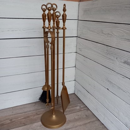 Bestaat uit een vuurtang, veger en blik en een pook.