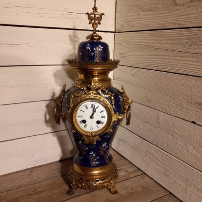 Hij is gemaakt van keramiek, brons en verguld brons. Mooi cobalt blauw, met handbeschilderde decoratie.