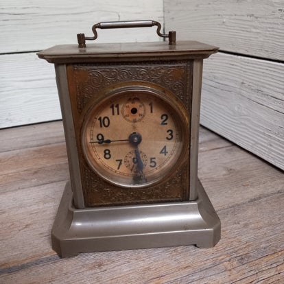 Deze antieke klok dateert waarschijnlijk van begin 1900. Hij heeft een prachtig gedetailleerd binnenwerk, wat ook zichtbaar is door de glazen zijkanten. Helaas krijg ik hem niet opgewonden. De veer verspringt. Voor de liefhebber kan dit een mooie klok zijn, of voor onderdelen.