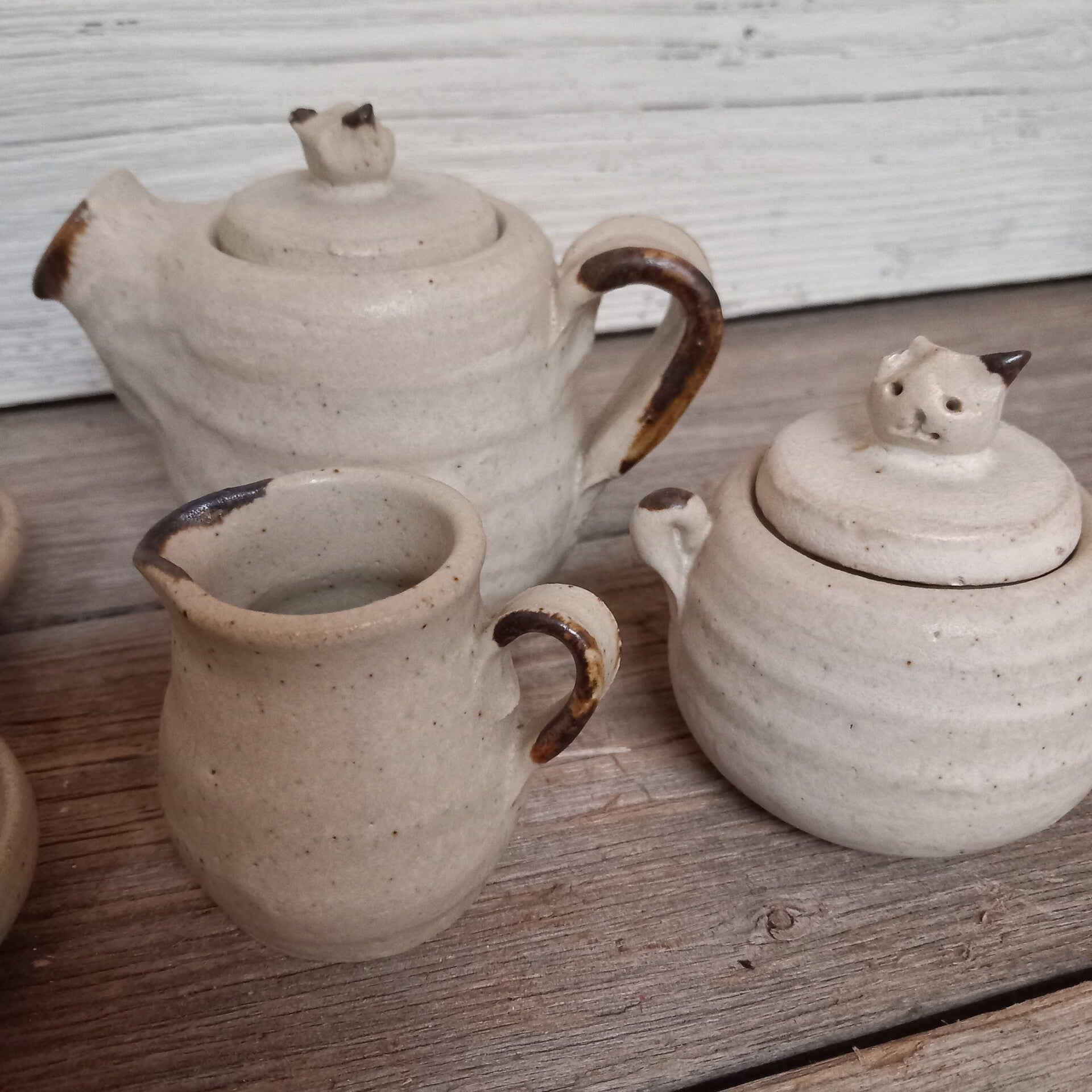 Superleuk degelijk serviesje, te groot voor een poppenhuis, wel precies goed als kinderservies. Handgemaakte keramiek.