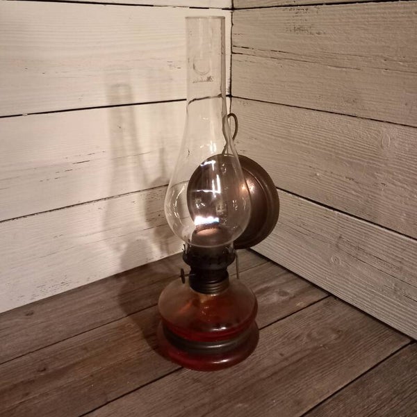 Authentieke sfeervolle olielamp, in werkende staat. Hij heeft een glazen reservoir, en achter de vlam zit een koperen schildje waarin de vlam reflecteerd. Hiermee voeg je een stukje sfeer toe aan je inrichting. Lonten voor deze lamp zijn nog gewoon te koop, en als brandstof kun je petroleum gebruiken.