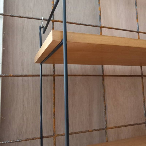 Metalen dragers, met 2 gefineerde schappen. Zeer eenvoudige montage, eenmaal bevestigd echter zeer stevig rek.