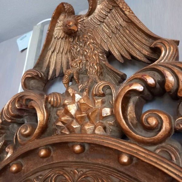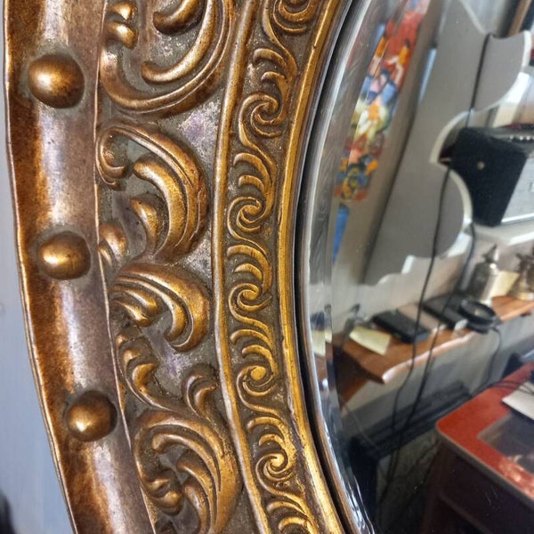 enorm grote vergulde spiegel, Italiaanse herkomst, tussen 1970 en 1979, naar een ontwerp uit de 19e eeuw. Door het gebruik van een lichte houtsoort en een composiet is hij voor zijn formaat niet al te zwaar. Deze spiegel kan een prachtige eye catcher zijn in je interieur.