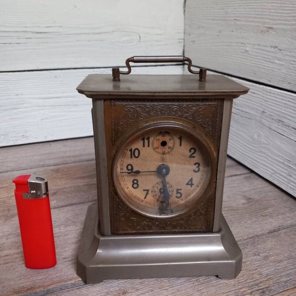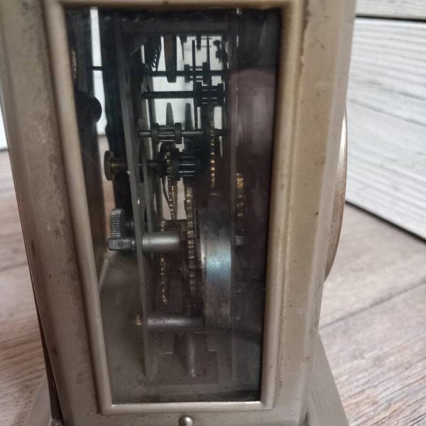 Deze antieke klok dateert waarschijnlijk van begin 1900. Hij heeft een prachtig gedetailleerd binnenwerk, wat ook zichtbaar is door de glazen zijkanten. Helaas krijg ik hem niet opgewonden. De veer verspringt. Voor de liefhebber kan dit een mooie klok zijn, of voor onderdelen.