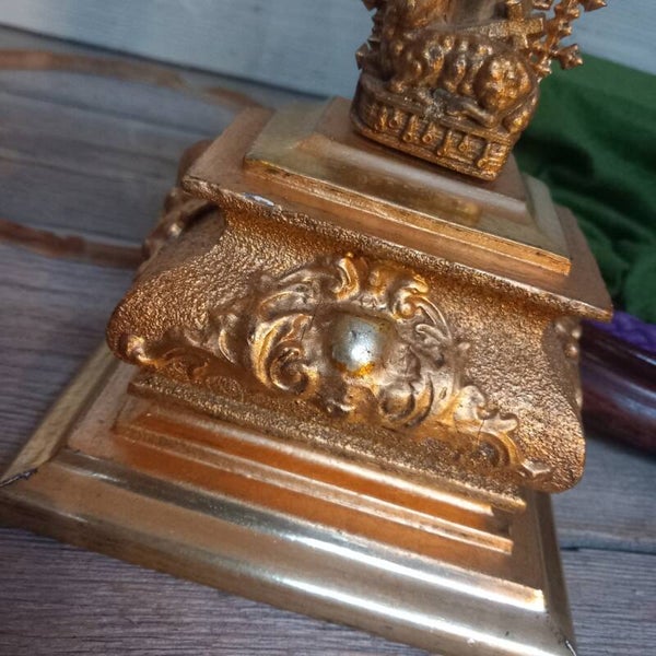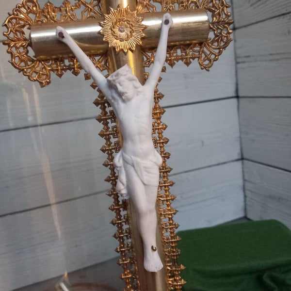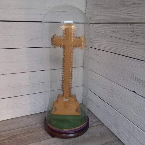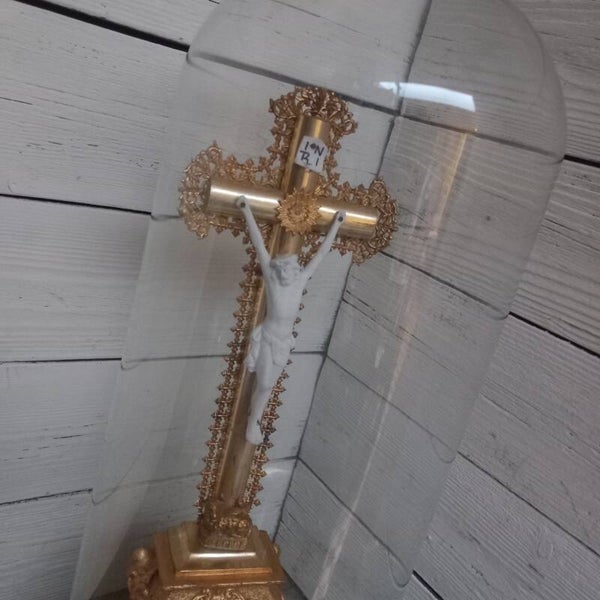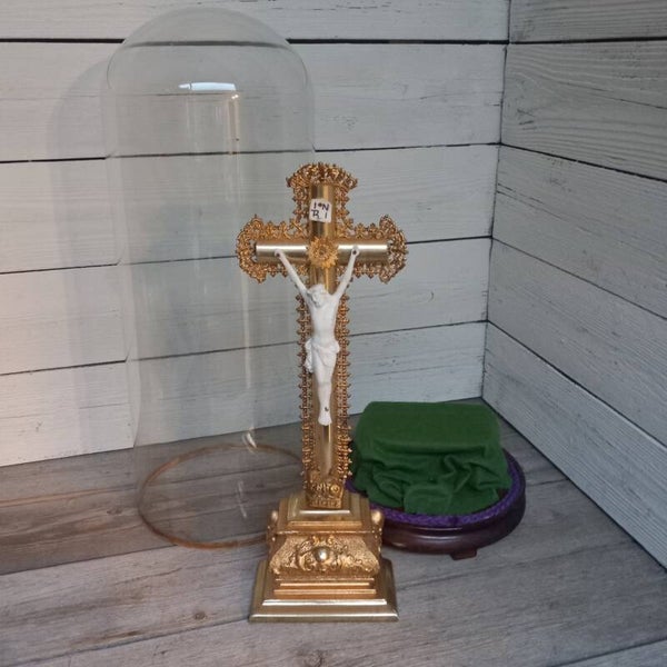 Prachtige vergulde crucifix mooi gedetaileerd. Hij staat op een kleine gestoffeerde verhoging op een houten voet. De glazen stolp is ook zonder gebreken.