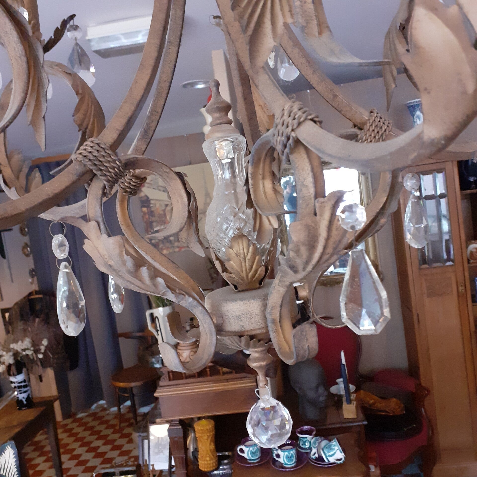 Verlichting: Kroonluchter met veel geslepen glazen elementjes, met 5 lichtpunten