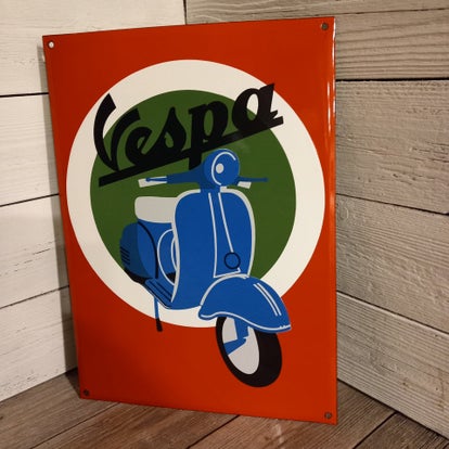 Een prachtig emaille bord met mooi dik emaille relief. Perfect voor een Vespa eigenaar, of als deco in je mancave.