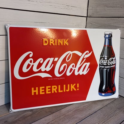 Een prachtig groot emaille bord. Gemaakt van 1,2 mm dik staal met prachtige heldere kleuren. Het bord heeft vier gaten voor de bevestiging. Mooi dik opgezette kleuren, bij bepaalde lichtinval geeft dit een mooi relief.